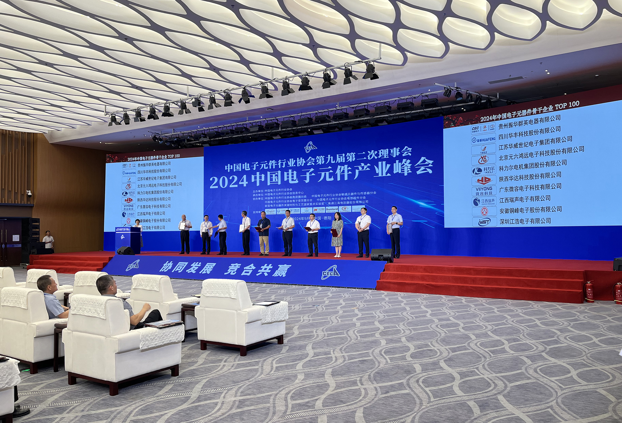 會(huì)議過程中,除舉辦主題演講、高端對(duì)話、分會(huì)平行論壇外,還舉行了2024年中國(guó)電子元器件行業(yè)骨干企業(yè)授牌儀式,公司再次獲評(píng)“中國(guó)電子元器件骨干行業(yè)TOP100 ”榮譽(yù),這是公司連續(xù)三十余屆入選行業(yè)百?gòu)?qiáng)。
