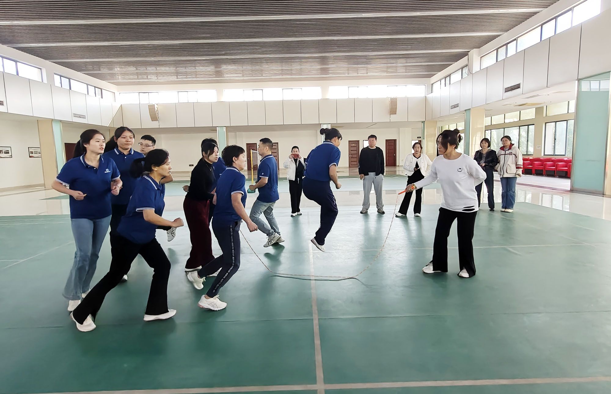 十人八字跳繩是一項極具挑戰(zhàn)性的集體協(xié)作項目,搖繩的隊員雙臂有力擺動,精準掌控節(jié)奏;跳繩隊員則如靈動的燕子,在繩間穿梭自如,形成一道道優(yōu)美的弧線。