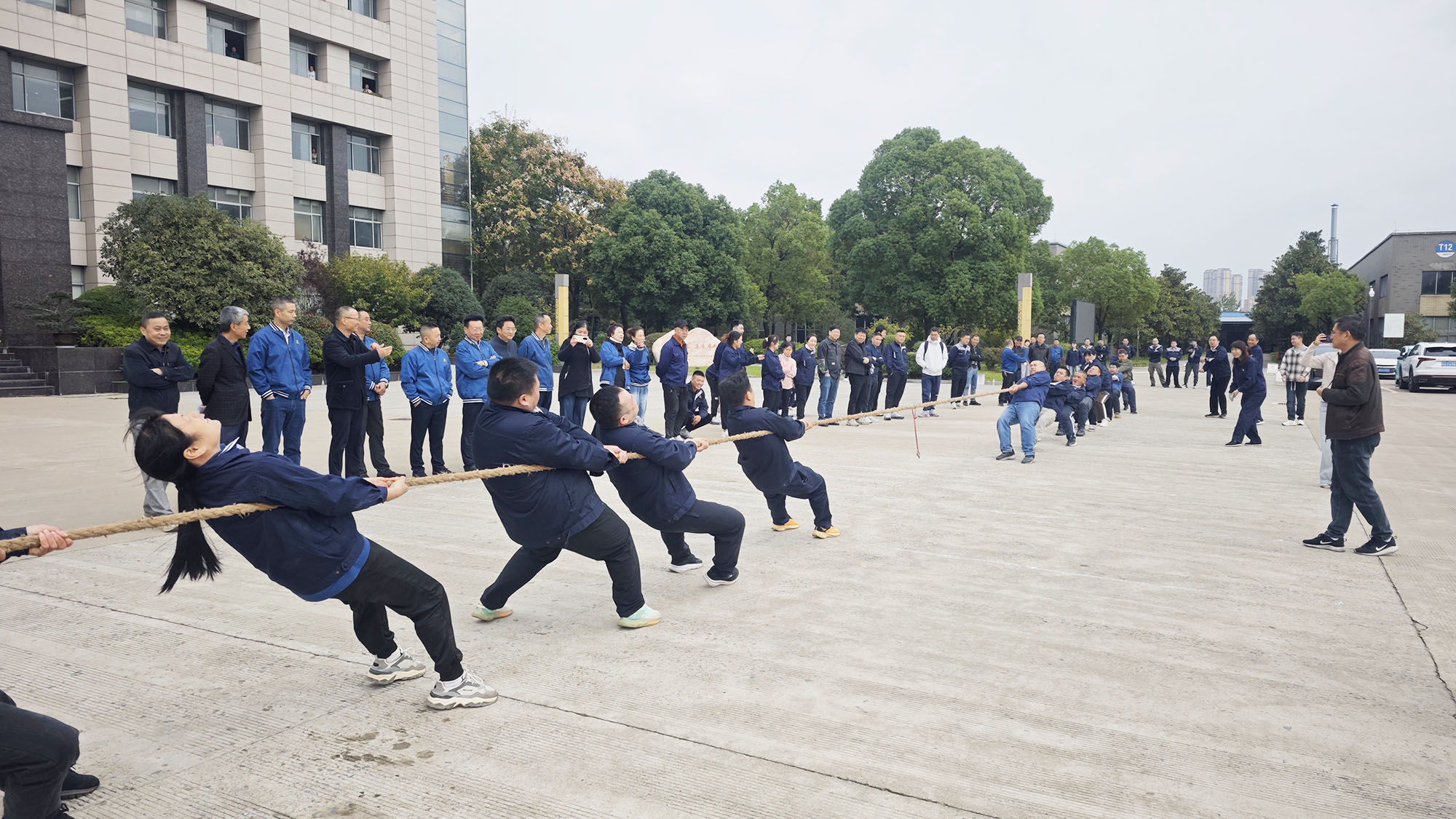 在拔河項目中,隊員們將彼此的力量與長繩融為一體,身體后傾成整齊的斜線,雙腳如釘般扎根地面,將團隊的合力凝聚在手中的繩索之上。